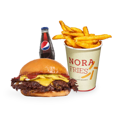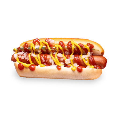 شريحتين من خليط الواجيو بالجبنة الامريكية وقطع البصل والمخلل الخاص بنا والكاتشب والخردل داخل خبزنا الطازج يوميا